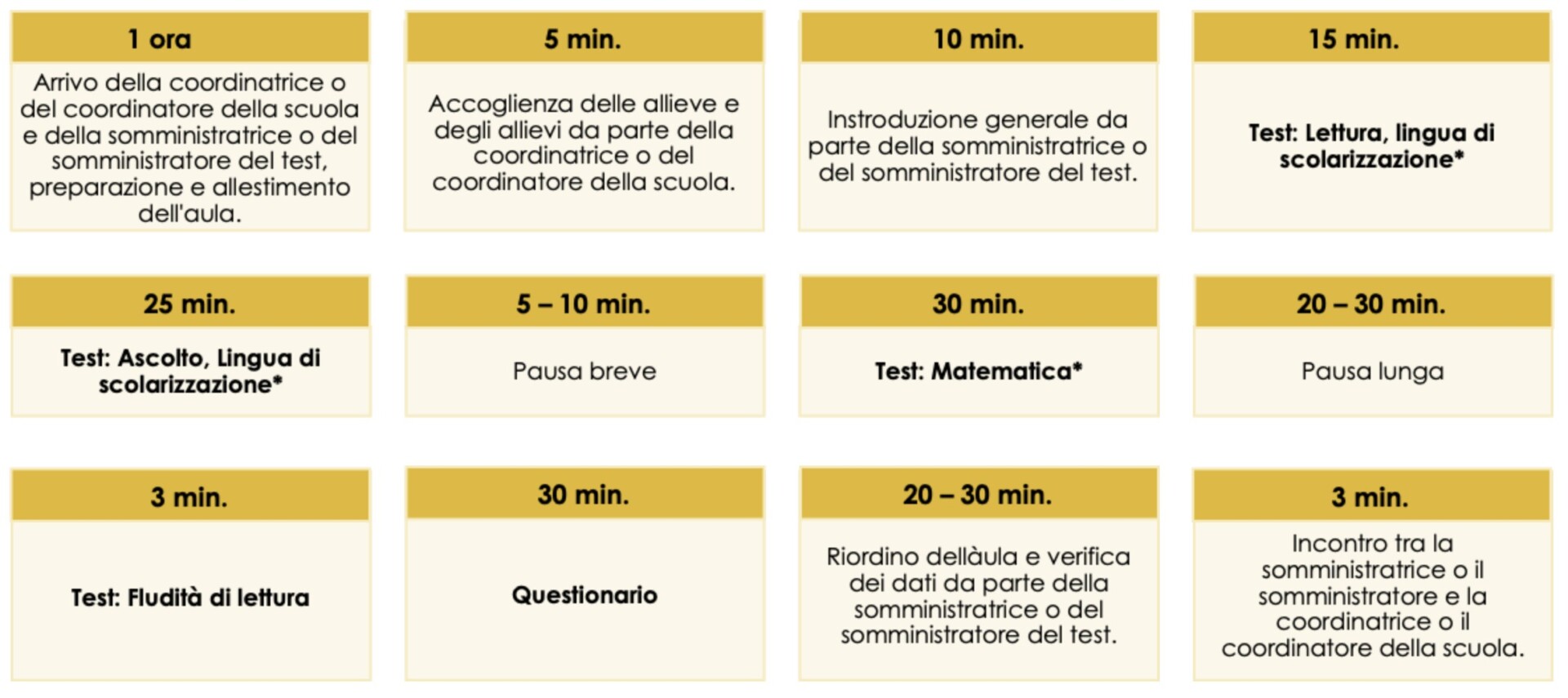 - la somministratrice o il somministratore del test porterà del materiale per occupare l’allieva o l’allievo nel caso in cui termina il test prima del previsto.